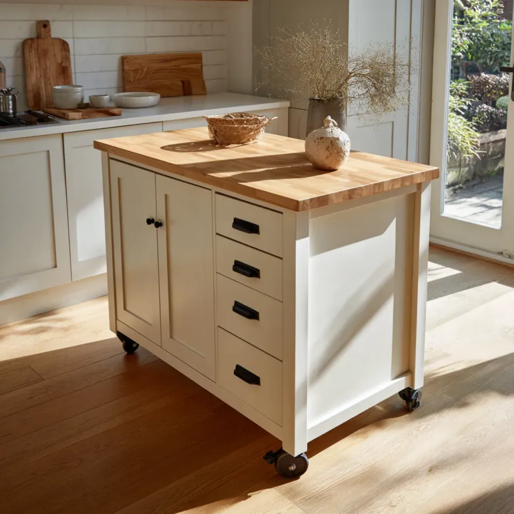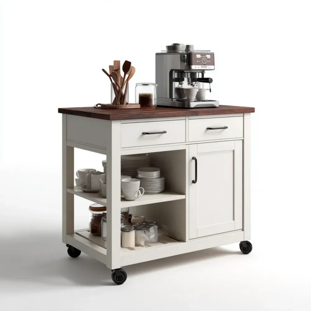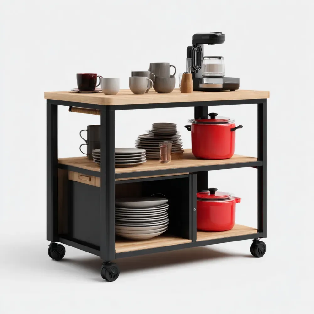 スチール製の支柱と木製天板を使用した移動式収納です。キャスターで場所を移動でき、ストッパーで固定も可能です。棚板の高さは調整可能で、調理器具や食品を整理して置けます。底面はメッシュ状で通気性があり、湿気を防ぎます。キッチンや居間の隙間でも使用できる設計です。